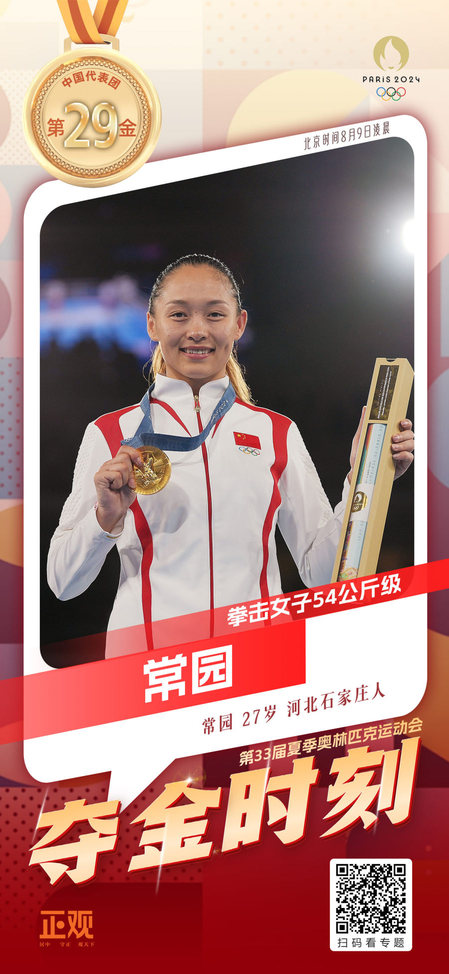 北京时间8月9日,在巴黎奥运会拳击女子54公斤级决赛中,中国选手常园战胜土耳其选手,夺得金牌。这是中国代表团在本届奥运会获得的第29枚金牌。