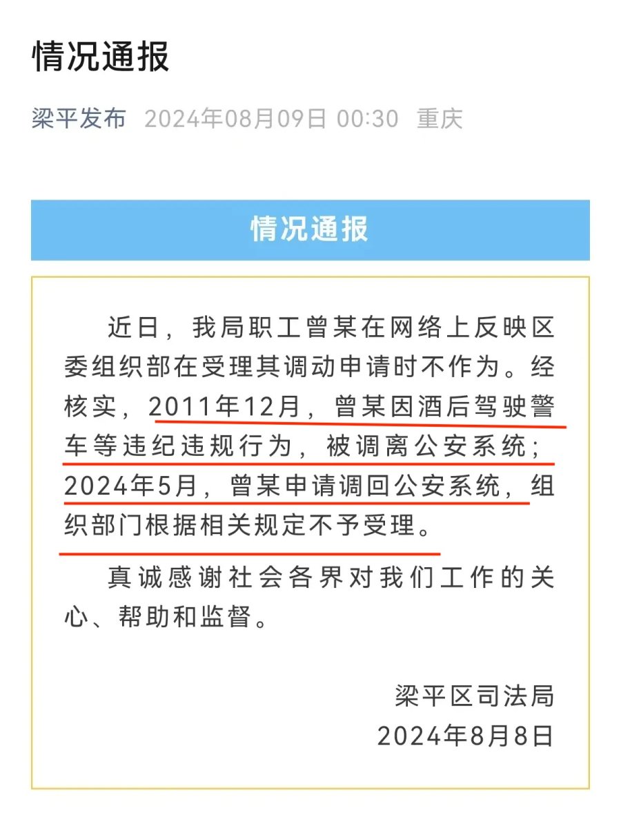 9日凌晨,梁平区司法局发布情况通报称,经核实,曾某于2011年12月,因酒后驾驶警车等违纪违规行为,被调离公安系统;2024年5月,曾某申请调回公安系统,组织部门根据相关规定不予受理。
