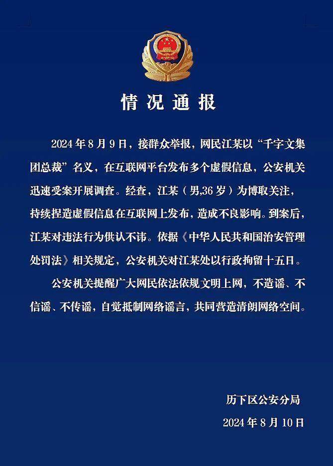 企业老板高调发文称“受多位官员关照”?警方通报:为虚假信息,江某被拘留15日