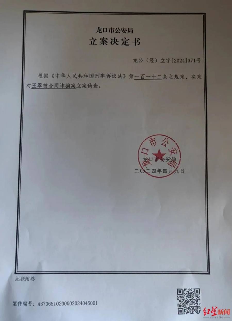 记者在龙口市公安局4月9日作出的立案决定书中看到,根据《中华人民共和国刑事诉讼法》第一百一十二条之规定,决定对王翠被合同诈骗案立案侦查。