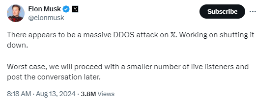 据美国有线电视新闻网(CNN)报道,当地时间12日晚,美国前总统、共和党总统候选人特朗普和美国知名企业家马斯克在社交媒体X(前身为推特)上开启访谈对话。当地时间8月12日晚8时42分左右,马斯克在社交媒体X上与特朗普进行了在线直播对话,他为推迟直播开始时间道歉,并重申直播是因网络攻击而延迟。该活动原定于当日晚8时开始。“X似乎遭受了大规模的DDOS攻击,正在努力将其关闭。”马斯克在一篇贴文中写道,此时超过活动预定开始时间大约半小时。马斯克还称,“最坏的情况是,活动继续进行,但将减少实时听众的数量,并稍后发布该对话。”