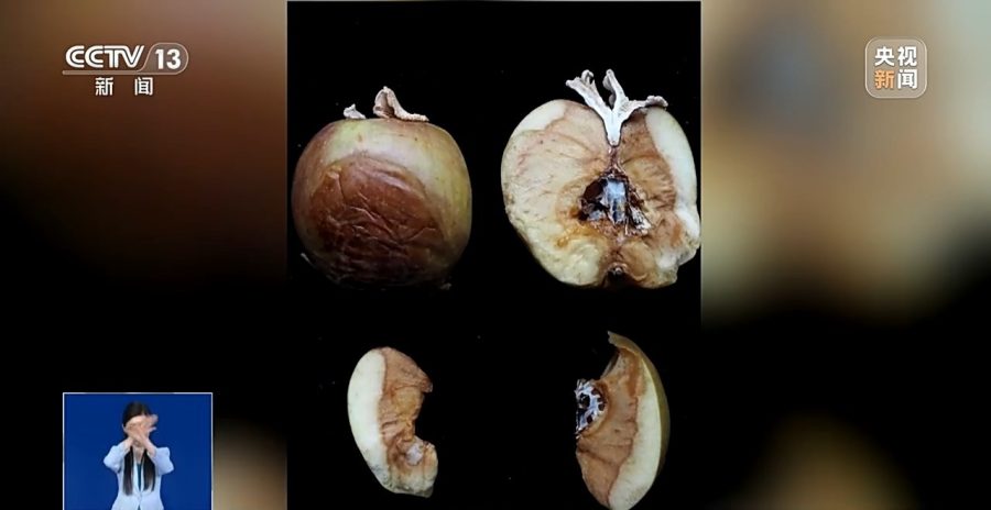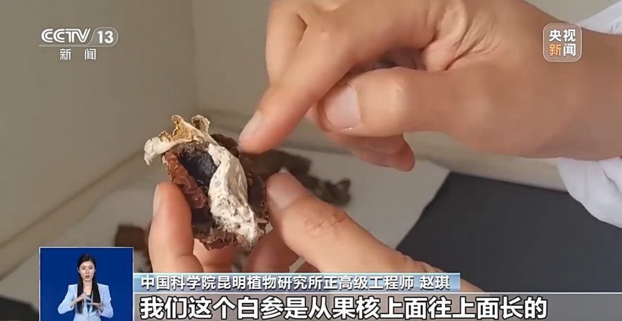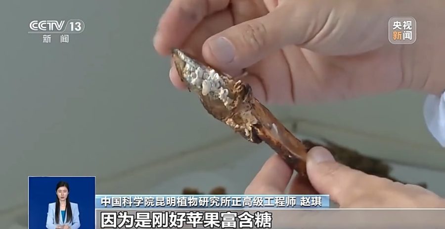 中国科学院昆明植物研究所正高级工程师 赵琪:苹果已经萎缩成苹果干了,但是白参还是这样子的。现在就很清晰可以看到,这个白参是从果核上面往上面长的。苹果完全收缩完之后,你看在我手里面拿的这个,当时应该是这个样子的。你看现在果核这部分,这些白参的菌丝是白色的,还明显存在。