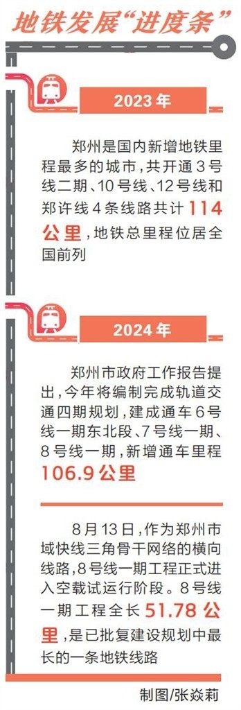 2023年,郑州是国内新增地铁里程最多的城市,共开通3号线二期、10号线、12号线和郑许线4条线路共计114公里,地铁总里程位居全国前列。8号线一期工程开通后,郑州的地铁总里程将达到396.61公里。