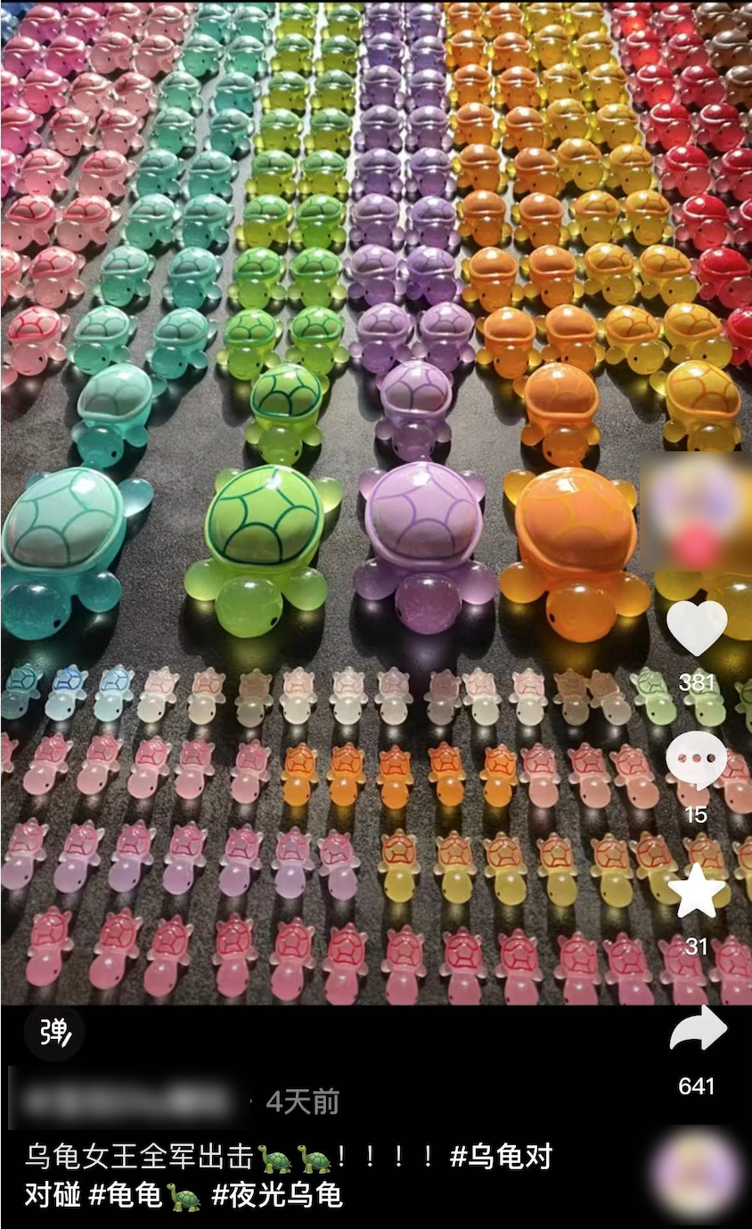 不少玩“乌龟对对碰”的网友都有自己的“乌龟大军”。社交平台上,有网友晒出不同颜色的树脂乌龟“祖孙四代”;还有网友家中乌龟已摆满一地,并表示还有100多个在路上。