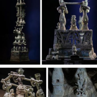 三星堆文化新发现的多层青铜器(图一)的青铜基座(图二),平面有四正四维四隅都有神巫,但是简化平面则呈现为九宫格、一门三道和昆仑山地中基本结构。