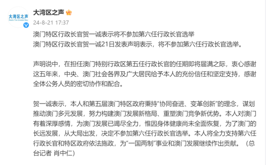 贺一诚表示,本人和第五届澳门特区政府秉持“协同奋进、变革创新”的理念,谋划推动澳门多元发展,努力构建澳门发展新格局、重塑澳门竞争新优势。本人对澳门有着深厚感情,为澳门发展已竭尽全力,惟因身体健康尚未全面恢复,为了澳门的长远发展,从大局出发,决定不参加第六任行政长官选举。本人将全力支持第六任行政长官和特区政府依法施政,为“一国两制”事业和澳门发展继续作出贡献。