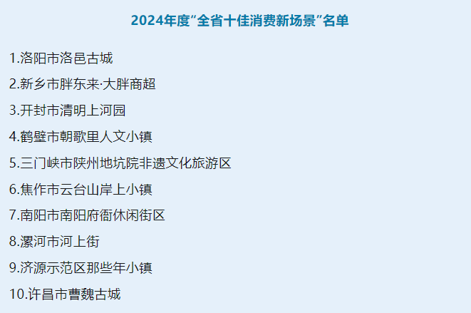 8月23日,记者从省发展改革委获悉,为推动我省消费场景适应发展新趋势,培育一批带动性强、显示度高、可持续发展的消费新场景,激发消费新活力,省发展改革委会同省农业农村厅、商务厅、文化和旅游厅、市场监管局组织开展2024年度“全省十佳消费新场景”认定工作。经自愿申报、实地核查、专家评审等程序,择优评选出了洛阳市洛邑古城等10个消费场景为2024年度“全省十佳消费新场景”。