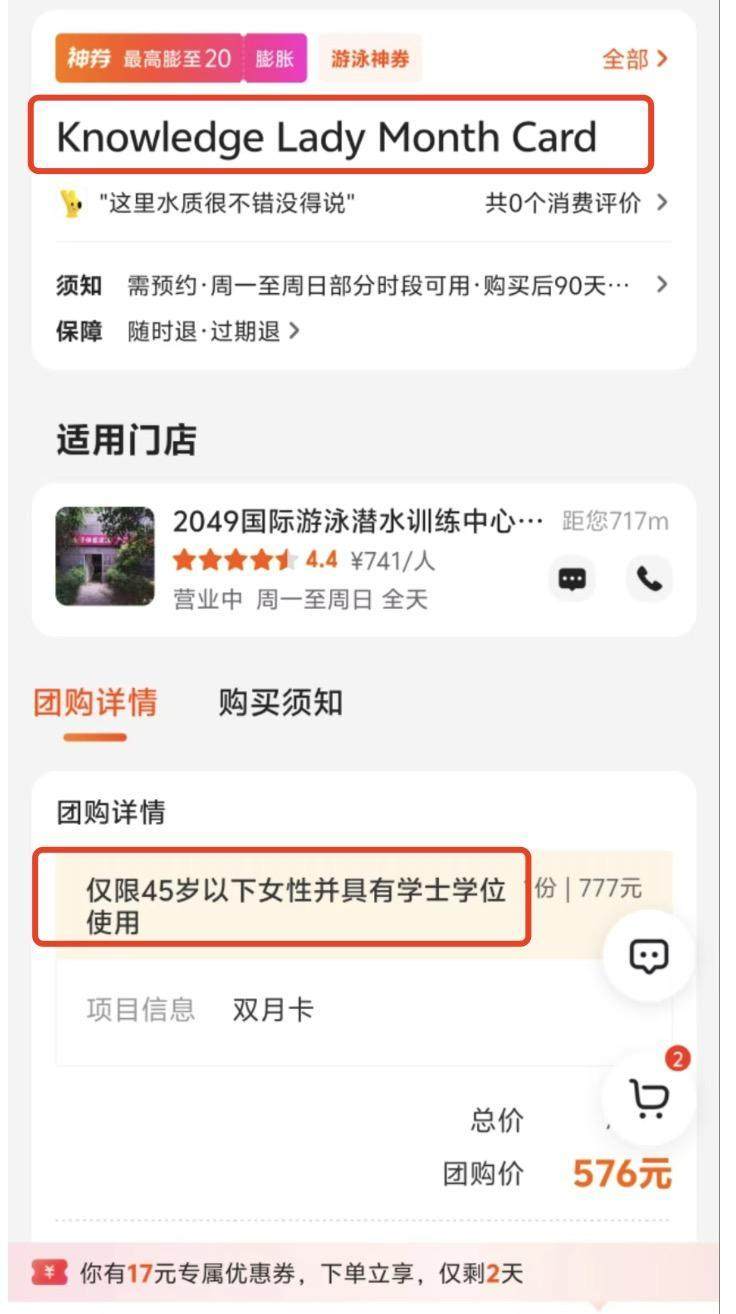 据现代快报报道,有网友发帖称,在无锡一家游泳馆团购游泳卡,要求消费者必须为45岁以下女性并有学士学位,引发了网友们对于该游泳馆消费歧视的质疑。