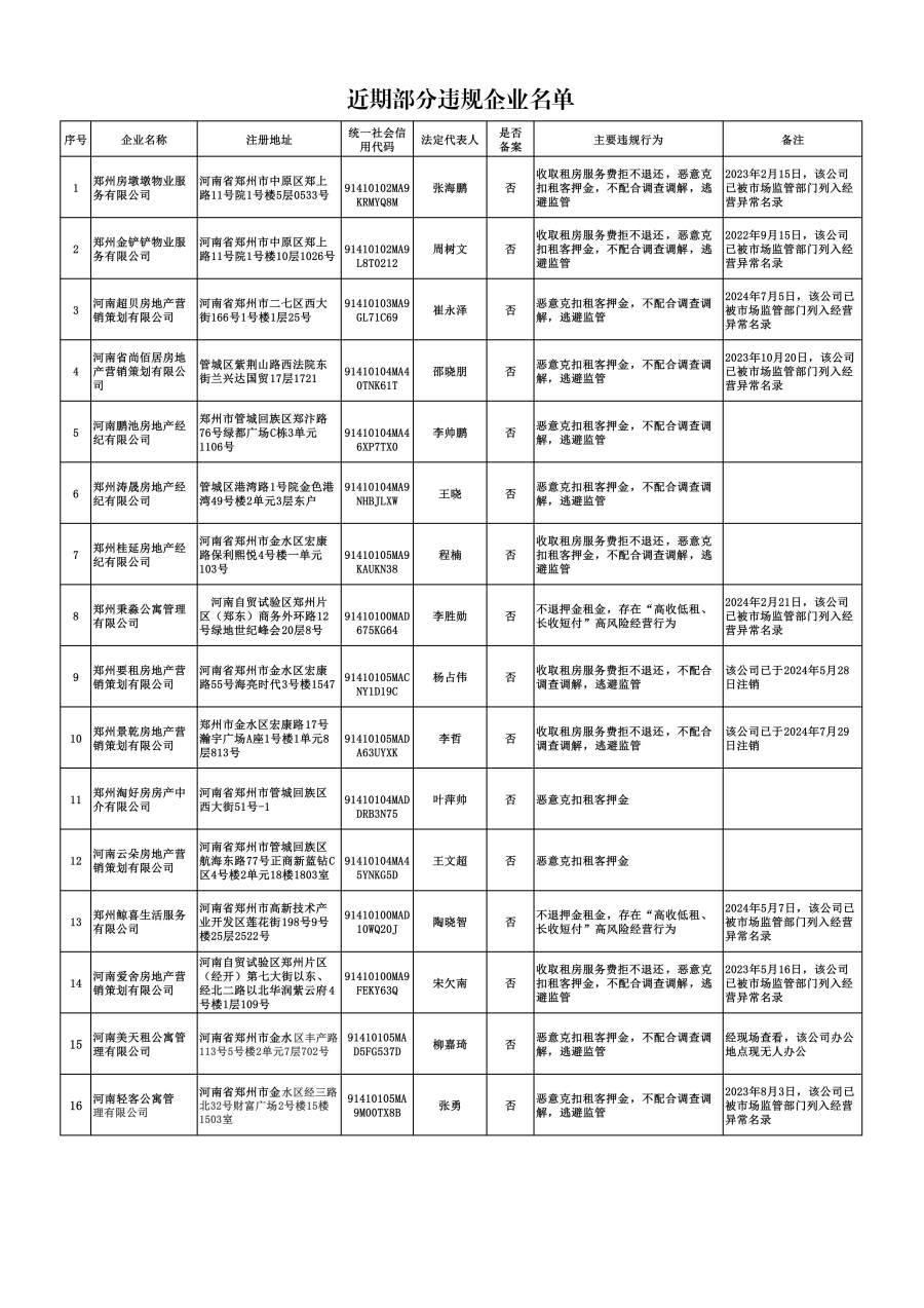 为切实维护广大租房群众的合法权益,维护我市房屋租赁市场平稳健康发展,现将近期部分违规企业名单公布如下。
