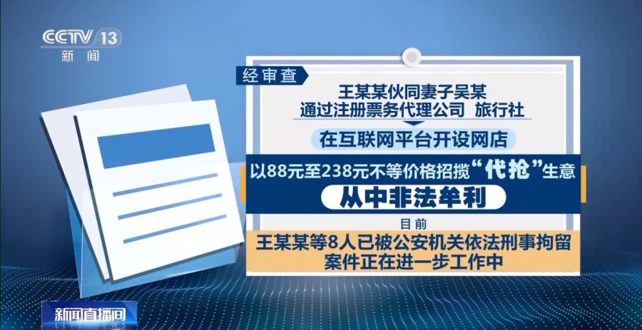 经审查,王某某伙同妻子吴某通过注册票务代理公司、旅行社,在互联网平台开设网店,以88元至238元不等价格招揽“代抢”生意,从中非法牟利。目前,王某某等8人已被公安机关依法刑事拘留,案件正在进一步工作中。