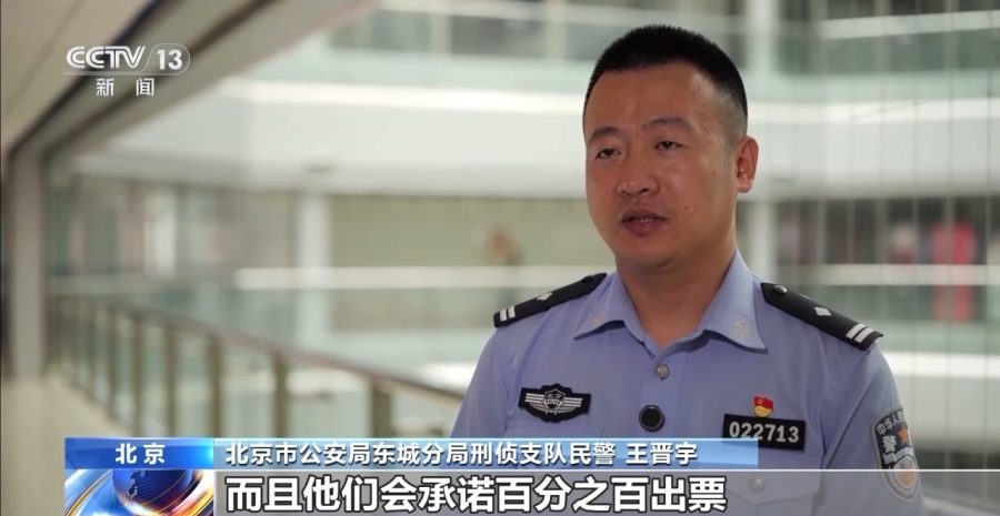 北京市公安局东城分局刑侦支队民警 王晋宇:“黄牛”会通过多种渠道招揽客源,而且他们会承诺百分之百出票。他们把游客的个人信息以及订票费用收取之后,把游客信息转给专门抢票的抢手。这些抢票的抢手会使用电脑软件或者以人肉众包(人工抢票)的方式进行抢票。抢票成功以后,招揽客源的“黄牛”和抢票的抢手,按比例来进行分成获利。