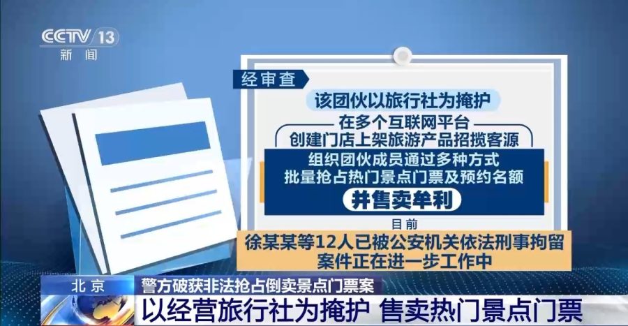 经审查,该团伙以旅行社为掩护,在多个互联网平台创建门店上架旅游产品招揽客源,组织团伙成员通过多种方式批量抢占热门景点门票及预约名额,并售卖牟利。目前,徐某某等12人已被公安机关依法刑事拘留,案件正在进一步工作中。
