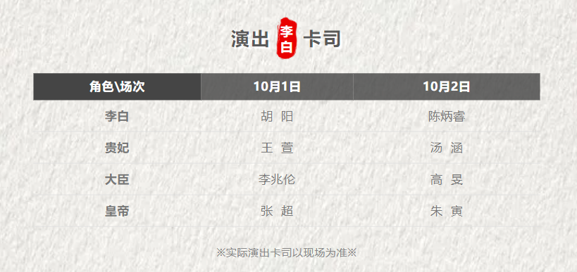 胡阳(饰李白),国家一级演员,文化部优秀拔尖人才,第八届全国桃李杯舞蹈少年组比赛银奖,第十届全国桃李杯舞蹈青年组比赛金奖,文化部优秀剧目展演优秀表演奖,中宣部五个一工程奖。代表作:《孔子》《赵氏孤儿》《李白》《狂歌行》《门》《肥唐瘦宋》《莲花》《明月几时有》等等。