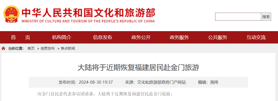 大陆将于近期恢复福建居民赴金门旅游