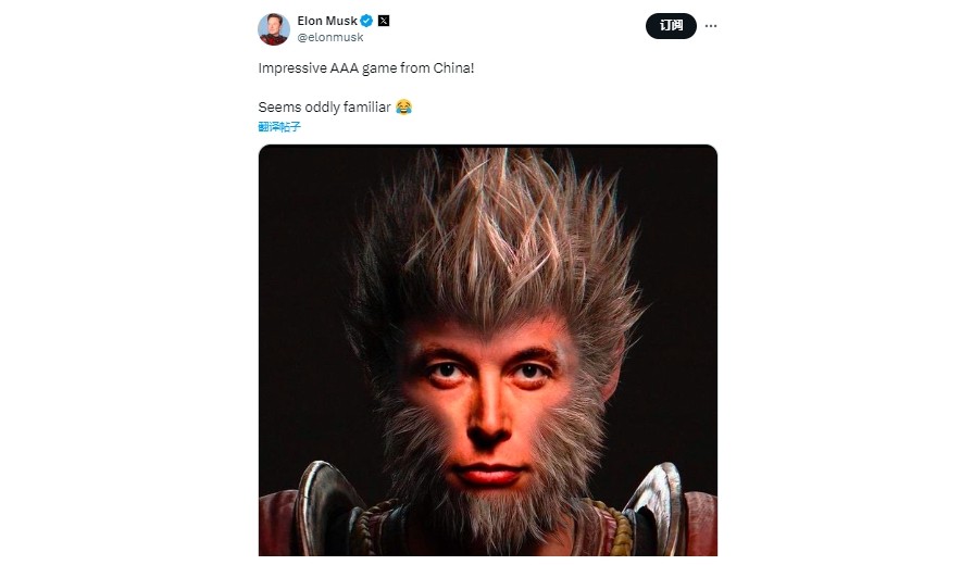 马斯克在社交平台帖子中说:“来自中国的令人印象深刻的3A游戏!似乎莫名熟悉。(指由AI合成的‘悟空’照片)”在评论区,许多留言和马斯克一样推荐这款游戏,甚至还贡献了更多把马斯克和《黑神话:悟空》合在一起的“P图”。