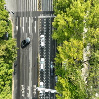 最左侧一个“可变车道”显示白色左转箭头,相邻“可变车道”显示白色直行箭头,车辆按LED“可变车道”指示屏的方向指示,有序左转或直行,只一个信号灯周期等红灯车辆全部放空,提高了道路通行效率。