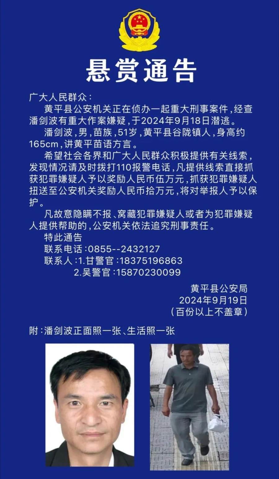 通告称,黄平县公安机关正在侦办一起重大刑事案件,经查,潘剑波有重大作案嫌疑,于9月18日潜逃。潘剑波,男,苗族,51岁,黄平县谷陇镇人,身高约165cm。