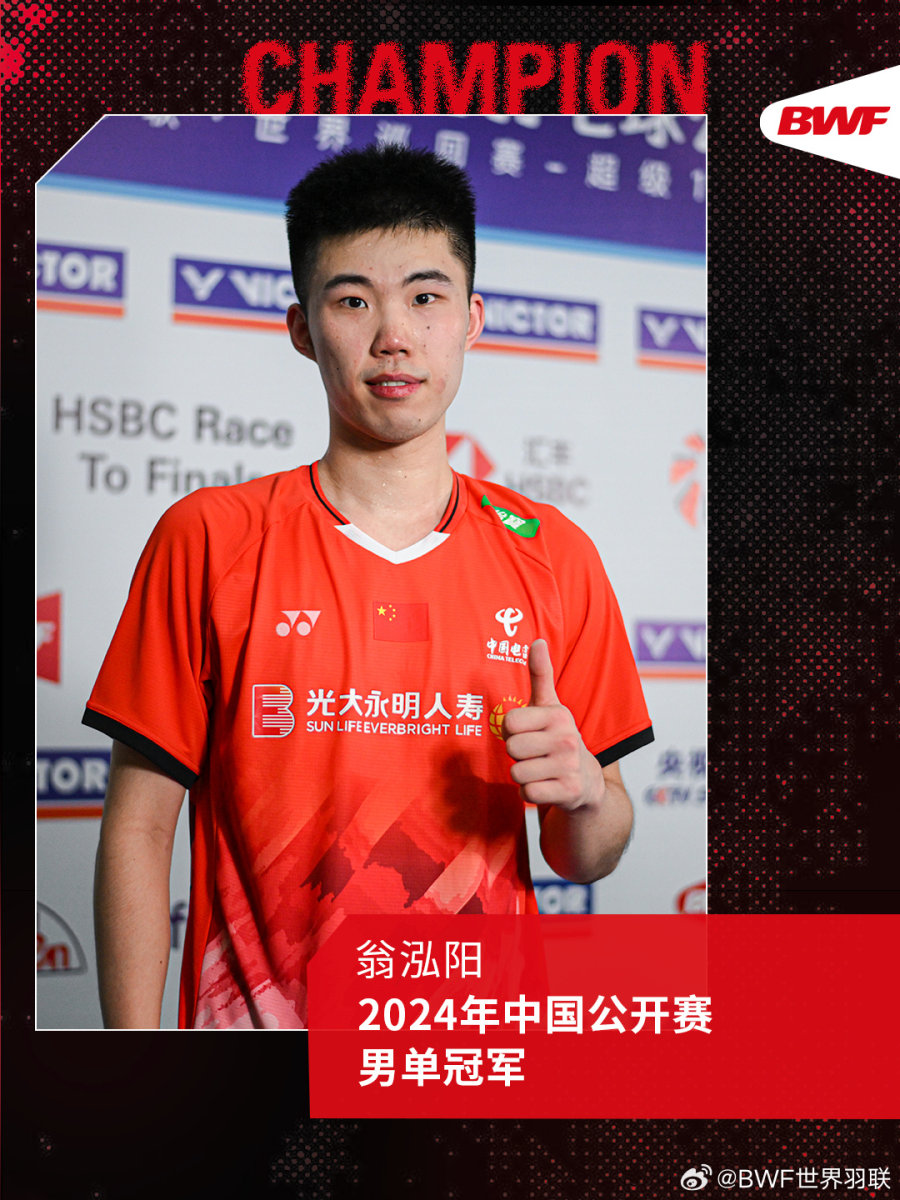 恭喜翁泓阳!国羽男单时隔7年再夺中国公开赛冠军