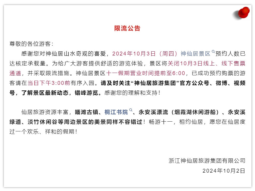 10月2日上午,神仙居旅游集团发布公告,2024年10月3日(周四)神仙居景区预约人数已达核定承载量。为给广大游客提供舒适的游览体验,景区将关闭10月3日线上、线下售票通道,并采取限流措施,神仙居景区十一假期营业时间提前至6:00。