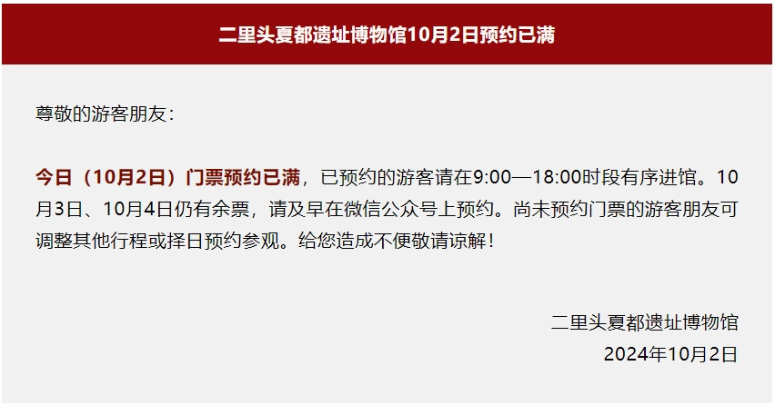 三星堆博物馆公众号门票预约显示,10月1日至10月6日白天门票都已约满,打算前往的观众可关注当日17:00放票情况。