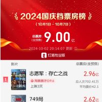 据网络平台数据,截至10月2日20时14分,2024年国庆档(10月1日—10月7日)档期内总票房(含预售)突破9亿。