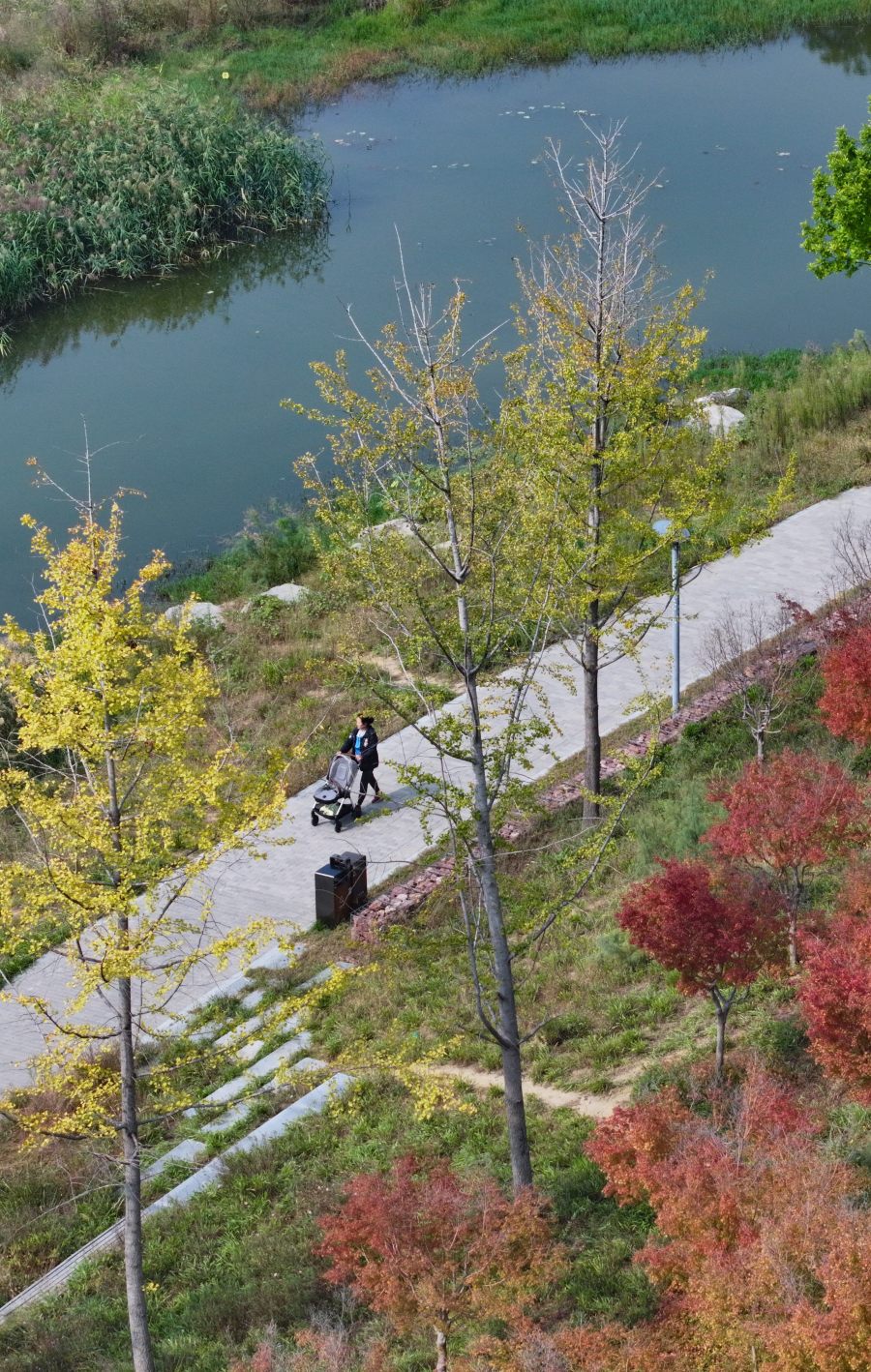 10月10日,西流湖公园南区,湖畔的红枫红得似火,银杏正在变黄,湖心岛上的芦苇在风中摇摆。