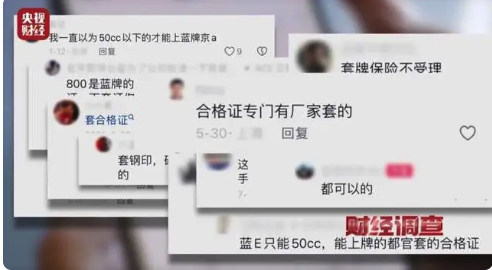 普通摩托车是如何获得轻便摩托车身份的呢?据报道,车行卖车时向车主收取一定费用,可以代办上蓝牌。其背后是出售合格证的套牌工厂,用一辆与被套牌车辆外观相同的车申报机动车辆产品准入,同时按轻便摩托车标准更改排量和车速等信息。