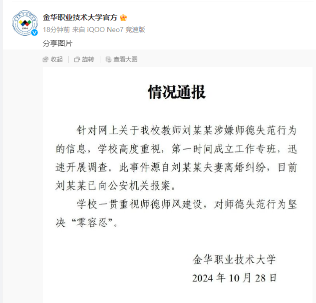 10月28日,金华职业技术大学通报:针对网上关于该校教师刘某某涉嫌师德失范行为的信息,学校高度重视,第一时间成立工作专班,迅速开展调查。此事件源自刘某某夫妻离婚纠纷,目前刘某某已向公安机关报案。