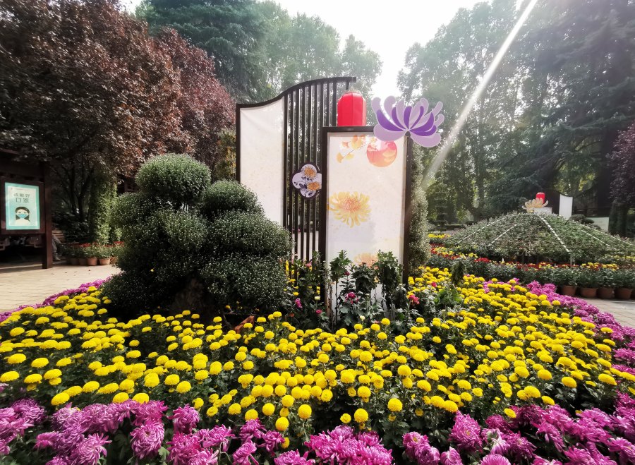 此次花展展期为10月29日至11月12日,共展出“貂蝉拜月”“唐宇傲狮”“古韵秋风”等百余个品种4万余盆,其中室外展区在东门内广场、秋园广场、中心广场、西门内广场设置大型主题花坛与菊艺造型,在西门外、大树树池等地结合现有绿地景观栽植菊花花境;竹园、青年路等地设置小的菊花展示节点串联室外各个菊花花坛、花境。