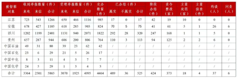 截至10月30日20时,各督察组共收到群众来电、来信举报5865件,受理有效举报4995件,经梳理合并重复举报,累计向被督察对象转办4464件。被督察对象已办结或阶段办结949件,其中立案处罚18家;立案侦查4件;约谈党政领导干部37人,问责党政领导干部6人。