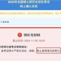 据正在新闻11月4日报道,近日,有网友发文称2025年考研网上报名系统中,辽宁抚顺报考点禁止使用海马体照片作为准考证照片。11月4日,抚顺市招考办工作人员表示,使用海马体照片可能会影响考试以及后续入学时的身份核验,因此“绝对不能用”海马体照片。此前,中国传媒大学也发布相关公告,明确表示“请勿使用海马体照片”。