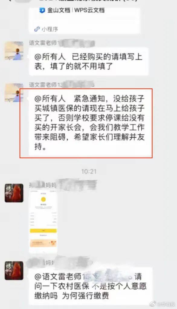 这位家长明明不满意,可最后还是买了,用他的话说,“你不买,天天在群里催,小孩都被区别对待了。”所以很明显,学校就是在变相地强制学生购买医保,甚至将其跟教学挂钩。