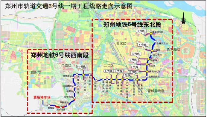 轨道交通6号线覆盖郑州市西南至东北轴向的城市轨道交通骨干线路,西起荥阳市贾峪站,东至郑东新区清华附中站。该线路分为两期建设,首通段起于荥阳市贾峪站,止于中原区常庄站,设站10座,已于2022年9月30日开通运营。东北段线路起于中原区冯湾站,止于郑东新区清华附中站,设车站18座。