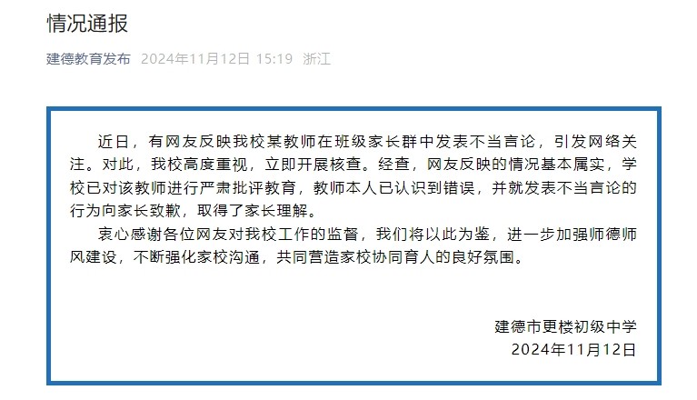 近日,有网友反映我校某教师在班级家长群中发表不当言论,引发网络关注。对此,我校高度重视,立即开展核查。经查,网友反映的情况基本属实,学校已对该教师进行严肃批评教育,教师本人已认识到错误,并就发表不当言论的行为向家长致歉,取得了家长理解。