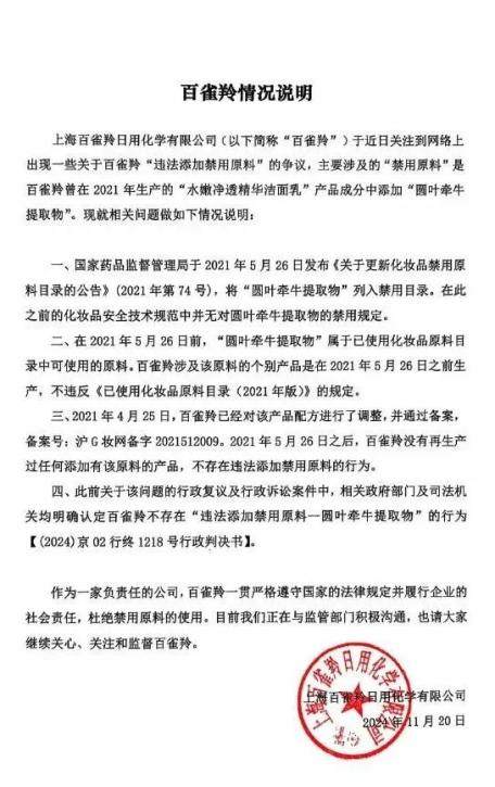11月20日,百雀羚针对近日舆论关注的添加禁用原料事件发布情况说明,称不存在违法添加禁用原料行为。声明中提及,“涉事原料为圆叶牵牛提取物,2021年4月25日,百雀羚已经对该产品配方进行了调整,并通过备案,2021年5月26日之后,百雀羚没有再生产过任何添加有该原料的产品,不存在违法添加禁用原料的行为。”