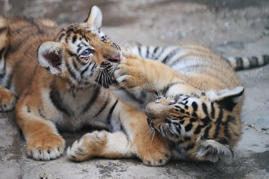 郑州市动物园今年出生的两只虎宝宝在打闹—郑州市动物园供图