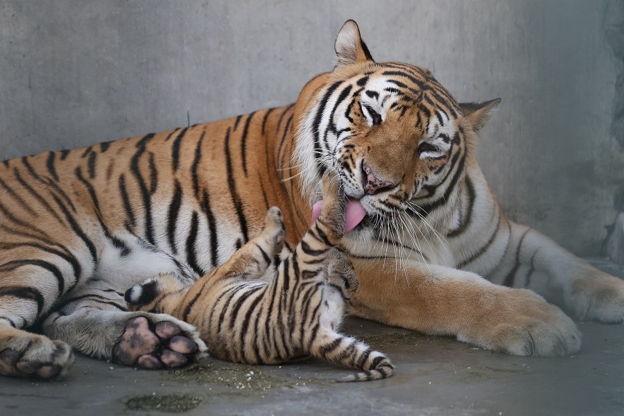 据饲养员介绍,今年2月份,雄虎一月和雌虎欢欢繁育出今年第一只小东北虎。当时正值寒冬,虎妈妈欢欢奶水不够,虎宝宝只能由人工抚育。虎宝宝被取名为团子,饲养员昼夜守护着团子,白天每隔两个小时喂一次奶,夜间每隔三个小时喂一次奶,虎宝宝出生40天左右时开始给它喂牛肉、鸡蛋等食物,如今团子长得身强体壮,体重已接近100斤。