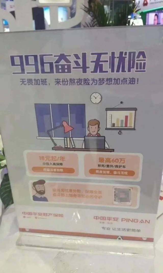 据《潇湘晨报》报道,11月25日,有网友反映了一个名为“996奋斗无忧险”的保险产品宣传牌。记者注意到,同样的牌子照片在2019年就出现过。