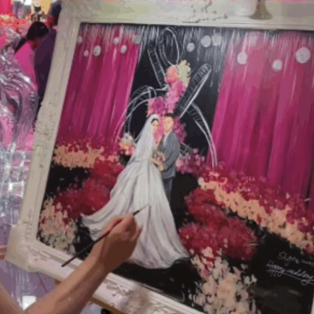 而每每在婚礼上完成一幅画作后,画师铁铁还会特别交代婚礼主持增加一个上台展示的环节。“每次在典礼快结束时,我会让主持人把我叫上去,将现场画好的精彩画作展示给所有人,再亲手送到新郎新娘手中,给新人一个庄重的仪式感。”