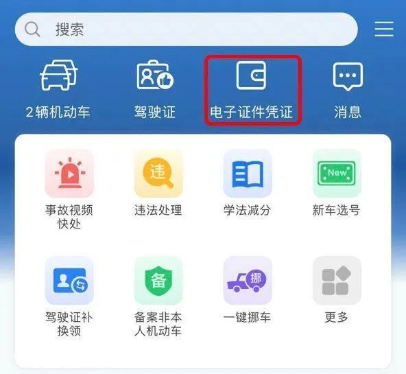 登录“交管12123”App,点击首页“电子证件凭证”功能,进入“电子证件”子功能,点击下方列表项即可显示电子行驶证。