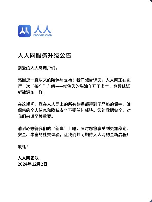 12月2日晚间,人人网团队发布公告称,人人网正在进行一次“换车”升级,“请耐心等待我们的‘新车’上路”。人人网团队称,在此期间用户在人人网上的所有数据都得到了严格的保护,确保用户的个人信息和隐私安全不受任何威胁。