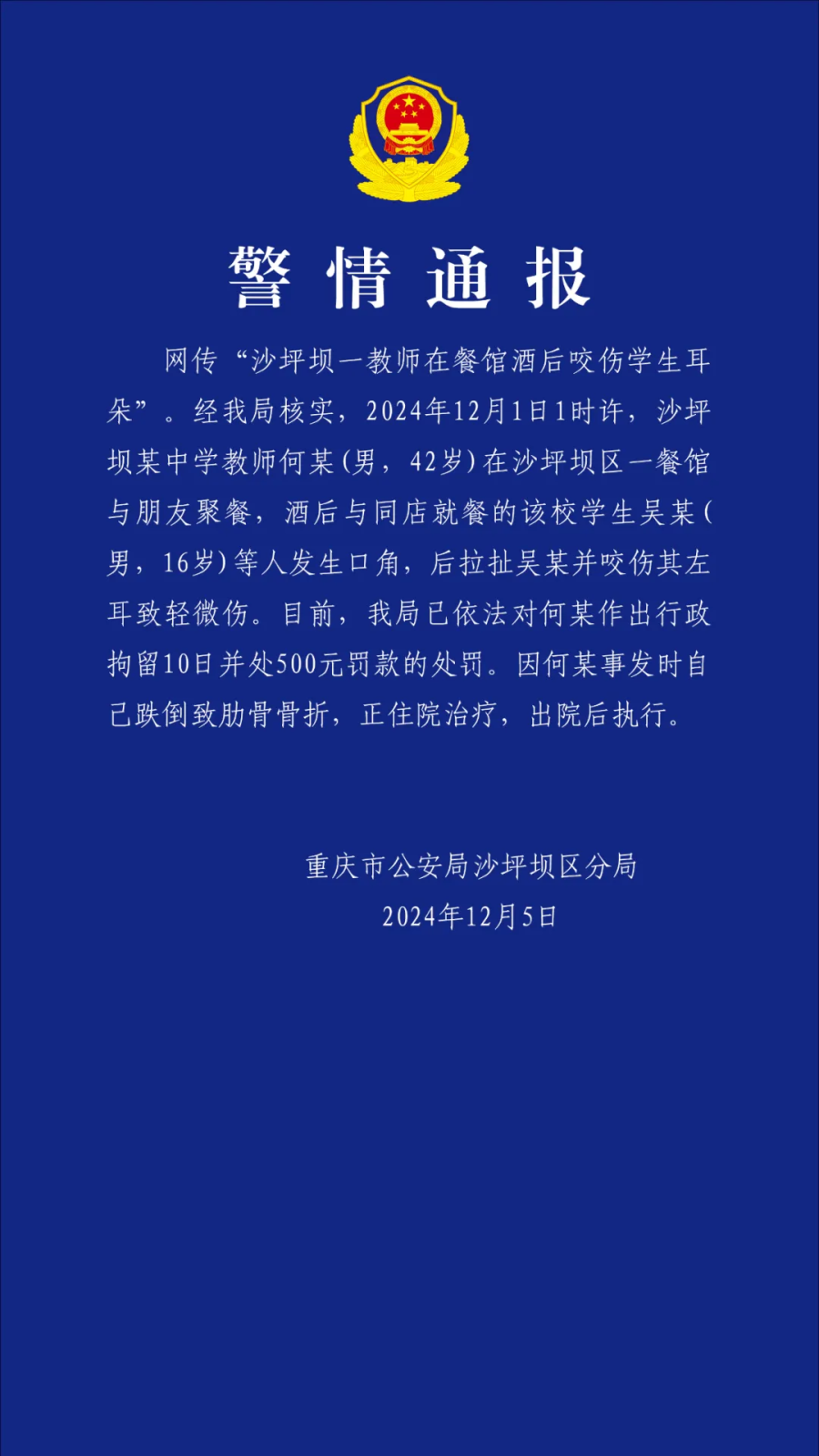 重庆市公安局沙坪坝区分局12月5日发布警情通报称,网传“沙坪坝一教师在餐馆酒后咬伤学生耳朵”,经核实,12月1日1时许,沙坪坝某中学教师何某(男,42岁)在沙坪坝区一餐馆与朋友聚餐,酒后与同店就餐的该校学生吴某(男,16岁)等人发生口角,后拉扯吴某并咬伤其左耳致轻微伤。目前,该局已依法对何某作出行政拘留10日并处500元罚款的处罚。因何某事发时自己跌倒致肋骨骨折,正住院治疗,出院后执行。