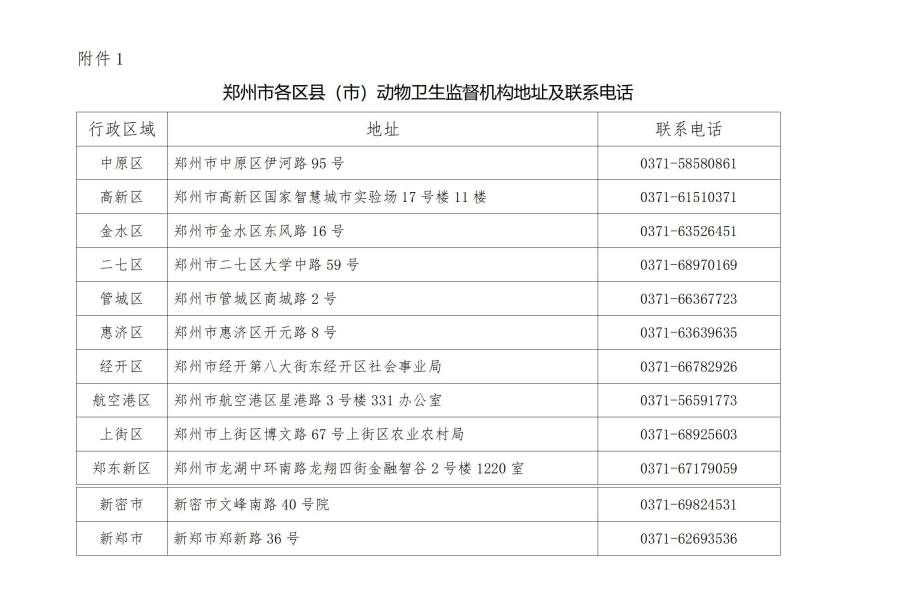 附件1 郑州市各区县(市)动物卫生监督机构地址及联系电话
