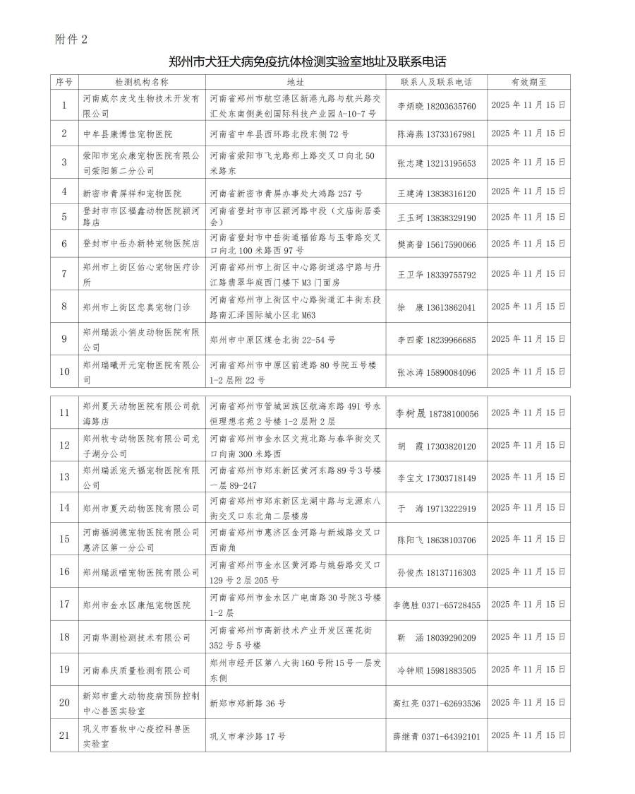 附件2 郑州市犬狂犬病免疫抗体检测实验室地址及联系电话