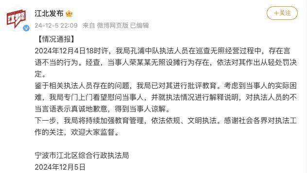 当地政府的反应还算迅速。12月5日,宁波市江北区综合行政执法局发布通报,在对涉事城管进行批评教育的同时,上门慰问女摊贩并当面道歉。但除此之外,也希望相关部门帮助女摊贩解决经营执照问题,引导其依法依规摆摊,只有这样,才是真正的执法人性化。