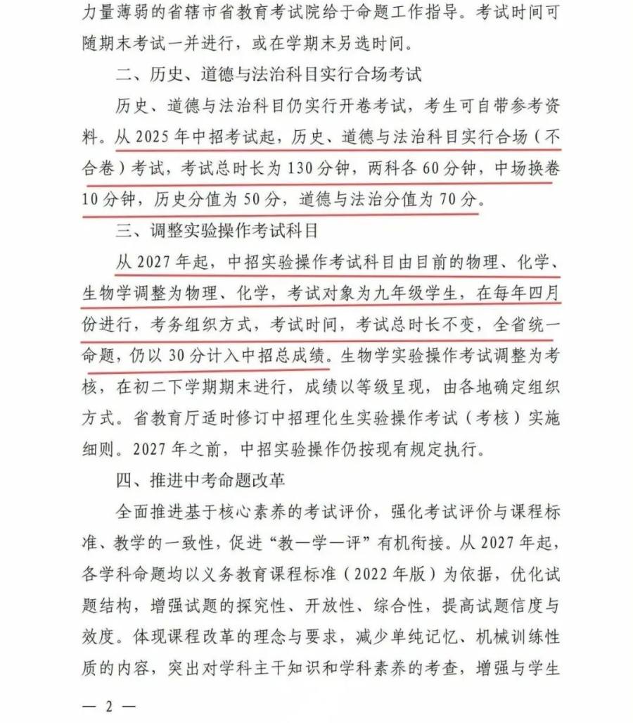 2025 年起,历史、道德与法治实行合场(不合卷)考,总时长 130 分钟,两科各 60 分钟,中场换卷 10 分钟,历史分值50分,道德与法治70分。