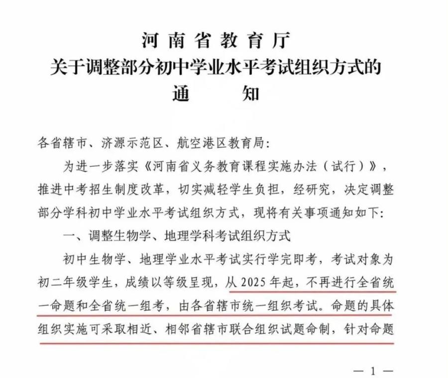 据悉,从2025年起,生物、地理不再全省统一命题,改由各省辖市自行组织,学完即考,对象是初二学生,成绩等级呈现。考试时间可随期末考试一并进行,或在学期末另选时间。