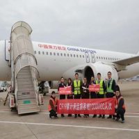 “您所乘坐的国产大飞机C919承运旅客人数在今天突破100万人次,第100万名旅客在本次航班上产生。”伴随着乘务长的客舱广播响起,全体旅客纷纷鼓掌庆祝,共同见证这一具有纪念意义的时刻。东航机组向幸运旅客林女士送上C919飞机模型作为纪念,林女士激动地表示,这是她第一次乘坐国产飞机,感觉非常幸运和自豪,她希望以后能在出行时更多体验“中国制造”,并祝愿国产大飞机越飞越好。