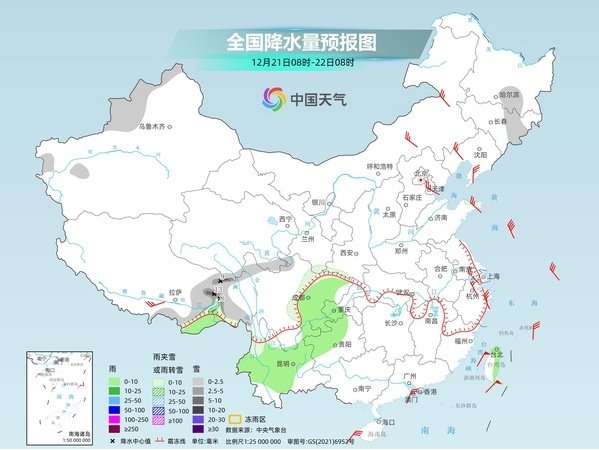 12月13日以来,我国大部地区以晴或多云天气为主,雨雪总体不多。一直到周末,这种雨雪稀少的格局还将持续,降水分布较零散,持续时间也较短。在南方,随着南支槽东移,加上低空冷空气渗透南下,22日起西南地区东部和南部、长江中下游等地有一次弱降水过程。