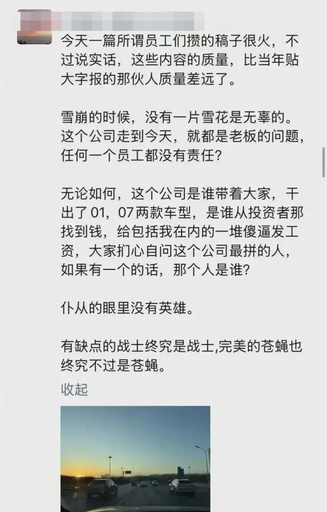 据相关截图显示,他说,“雪崩的时候,没有一片雪花是无辜的。这个公司走到今天,就都是老板的问题,任何一个员工都没有责任?”